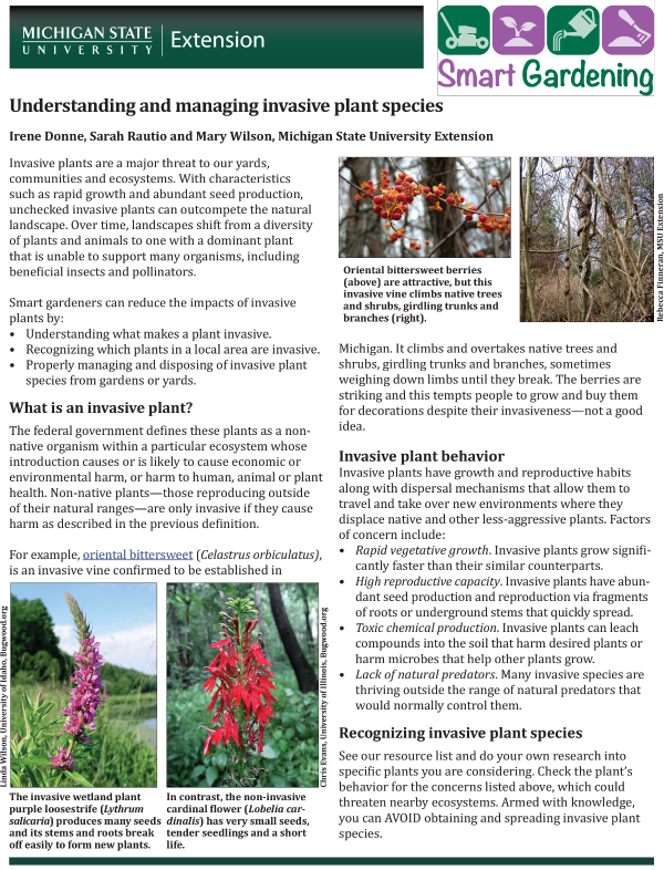 - For more information about avoiding potentially invasive landscape plants, contact your local MSU Extension consumer horticulture educator or call MSU Extension’s toll-free Lawn and Garden Hotline at 1-888-678-3464.