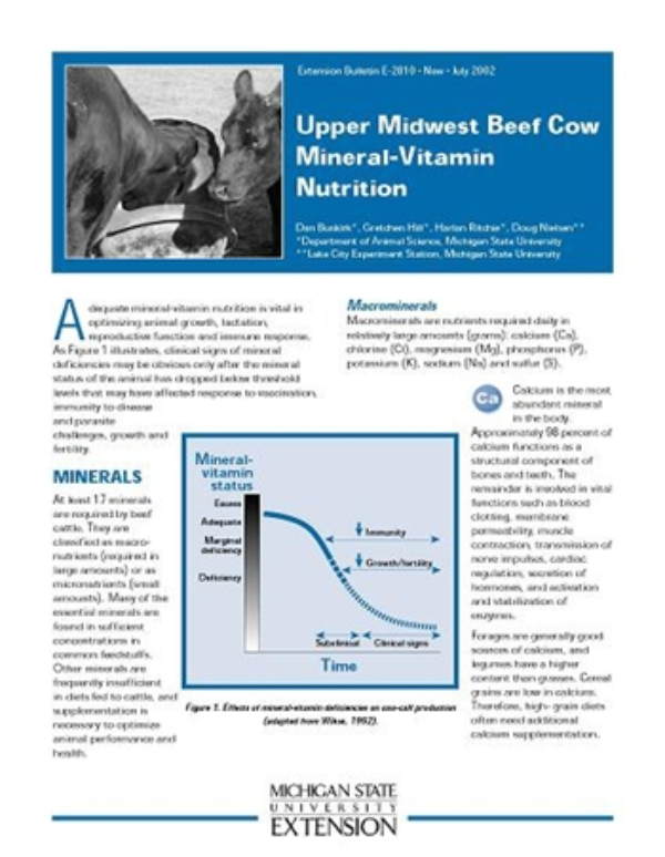 Ritchie, H., and C. Gibson. 1992. Mineral mixes for Michigan beef cow herds. Animal Science Staff Paper 253. East Lansing, Mich.: Michigan State University.