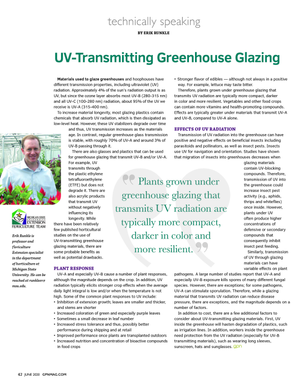 Most greenhouse glazing plastics absorb UV radiation to enhance their longevity. However, plants grown under glazing that transmits UV are typically more compact, darker in color, and more resilient.