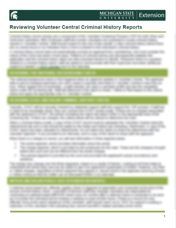 Criminal history record checks are a component of the Volunteer Screening Process (VSP) for both Silver and Gold level volunteers. MSU Extension staff who screen volunteers are expected to review criminal history reports in Volunteer Central.
