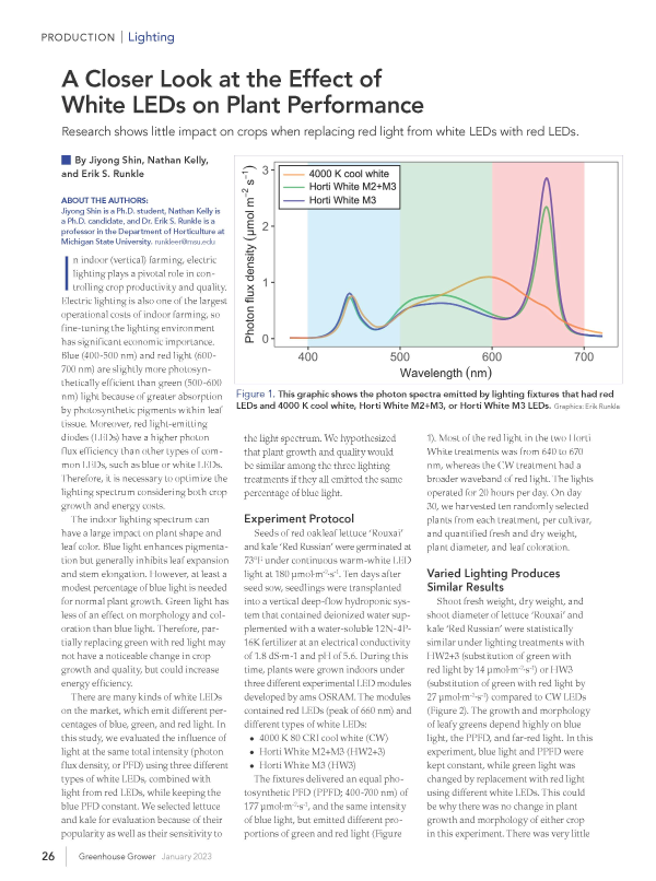 This article summarizes an experiment with lettuce and kale when grown indoors under different white light-emitting diodes (LEDs).