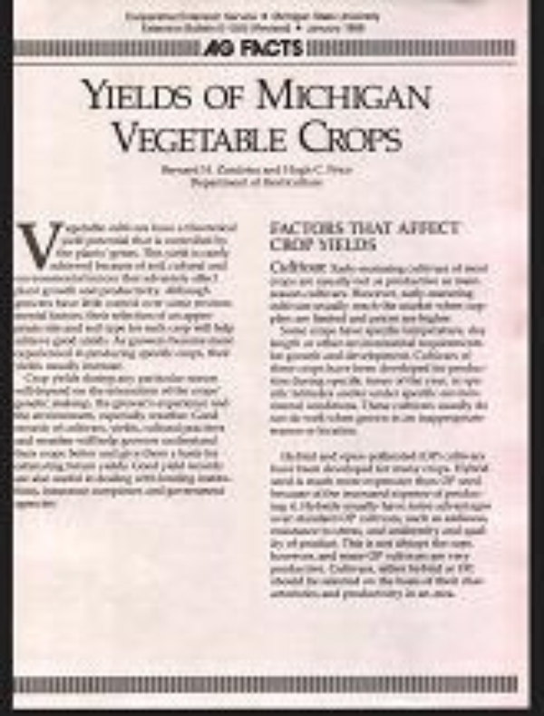 Vegetable Yields. The figures in Table 1 are based on information from the Michigan Agricultural Statistics Service, processing companies, Cooperative Extension agents, farmers and experience in trials at Michigan State University. Where limited information was available from Michigan, sources from neighboring states were consulted. Three figures are given for each crop: low yields, good yields and excellent yields.