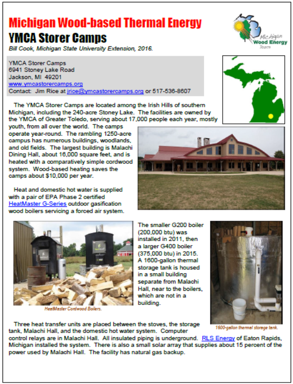 These facilities are located among the Irish Hills in Jackson County, including the 240-acre Stoney Lake. About 17,000 people visit each year, from all over the world. The main building, Malachi Hall, is 16,000 square feet and heated with forced air using the heat from a pair of outdoor cordwood boilers. Fuel is supplied by camp personnel and volunteers from woodlands on the property. Additionally, the system supplies the hot water needed for the kitchens and other uses. The system uses a 1600-gallon thermal storage tank.