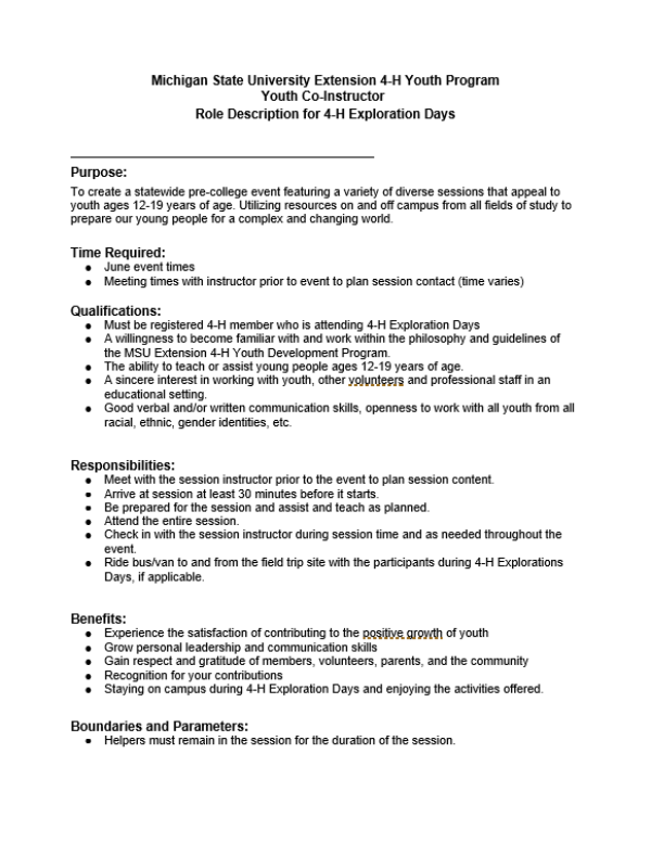 Youth Co-Instructor Role Description for 4-H Exploration Days