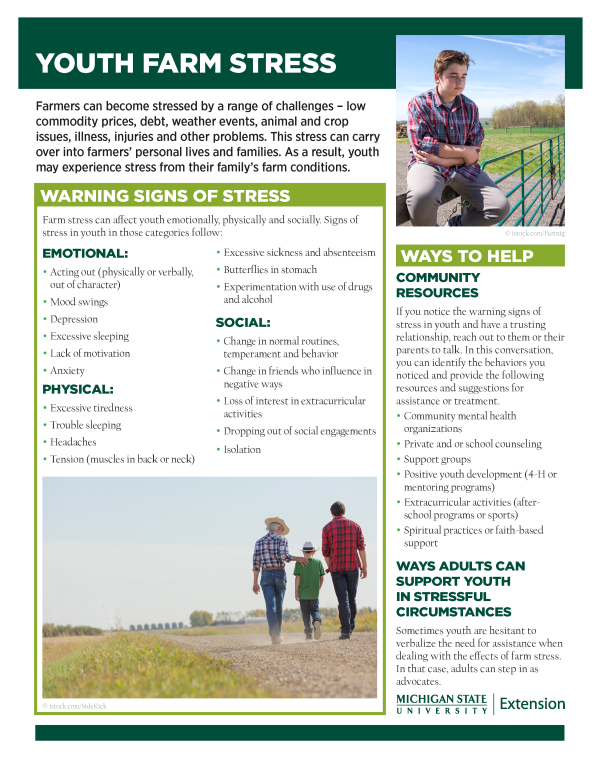 Farmers can become stressed by a range of challenges – low commodity prices, debt, weather events, animal and crop issues, illness, injuries and other problems. This stress can carry over into farmers’ personal lives and families. As a result, youth may experience stress from their family’s farm conditions.