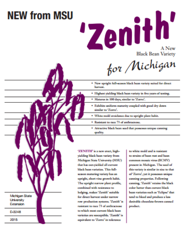 Kelly, J. D., Wright, E. M., Varner, G. V., & Sprague, C. L. (2015). ‘Zenith’: A new black bean variety for Michigan [E3248]. East Lansing: Michigan State University, MSU Extension.