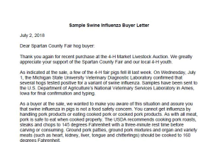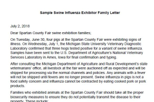 This sample letter can be used by fairs or exhibitions who had hogs test positive for swine influenza as a means of updating exhibitors and their families about the situation, importance of biosecurity and the human symptoms of which to be aware. -