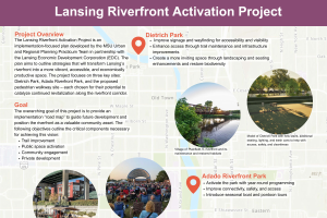 The Lansing Riverfront Activation Project is an implementation-focused plan developed by the MSU Urban and Regional Planning Practicum Team in partnership with the Lansing Economic Development Corporation (EDC). -