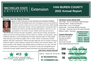Based on MSU Extension annual reporting and evaluation feedback, 2022 proved to be another good year leveraging resources provided by Van Buren County to help us do our work in the community. -