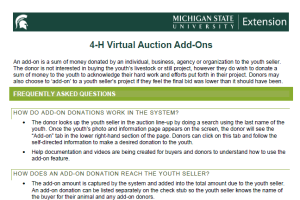 An add-on is a sum of money donated by an individual, business, agency or organization to the youth seller in a virtual auction. This document will answer frequently asked questions about the add-on feature of online sales. -