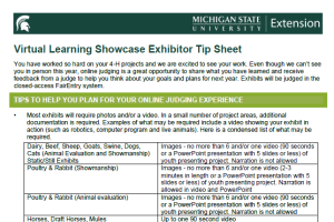 This helpful tip sheet can be customize by local fairs and distributed to youth exhibitors to help them plan for their online judging experience. -