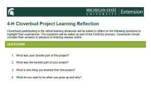 Cloverbuds participating in the virtual learning showcase will be asked to reflect on their experiences. The questions will be asked as part of the FairEntry process and should be considered in advance of entering classes online. -