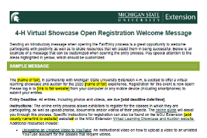 The following is suggested language for staff to utilize when updating fair books or communicating with exhibitors. These suggestions are only a starting point for staff; the text should reflect the requirements of your own virtual learning showcase. -