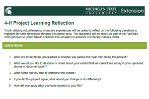 Youth utilizing virtual learning showcase experiences will be asked to reflect on questions to highlight life skills developed through the project area. The following questions are recommended for use as part of the FairEntry process. -