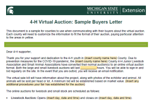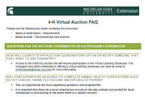 Auction coordinators and MSU Extension staff will find the answers to many of their questions regarding virtual auctions. Also includes FAQs for potential buyers and youth. -