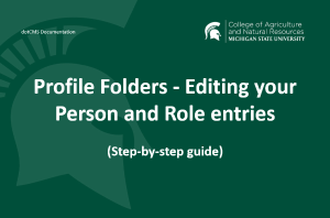 Profile Folders allow individuals and departments to access a folder which contains an individual’s Person and Role entries as well as subpages, page content, files, and images.